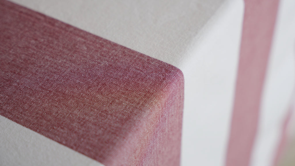 Dress your seasonal table with this burgundy and white yarn cotton tablecloth. Designed by us this exclusive seasonal stripe is a easy-care 100% cotton, available in three sizes including round. A timeless blend of warmth and elegance, this pattern is available in a cotton yarn tablecloth in three sizes and features bold burgundy and crisp white stripes woven with artisanal precision. Pair it with matching napkins for a coordinated look and finish with our burgundy red quilted placemats and our velvet now napkin rings or ribbon.